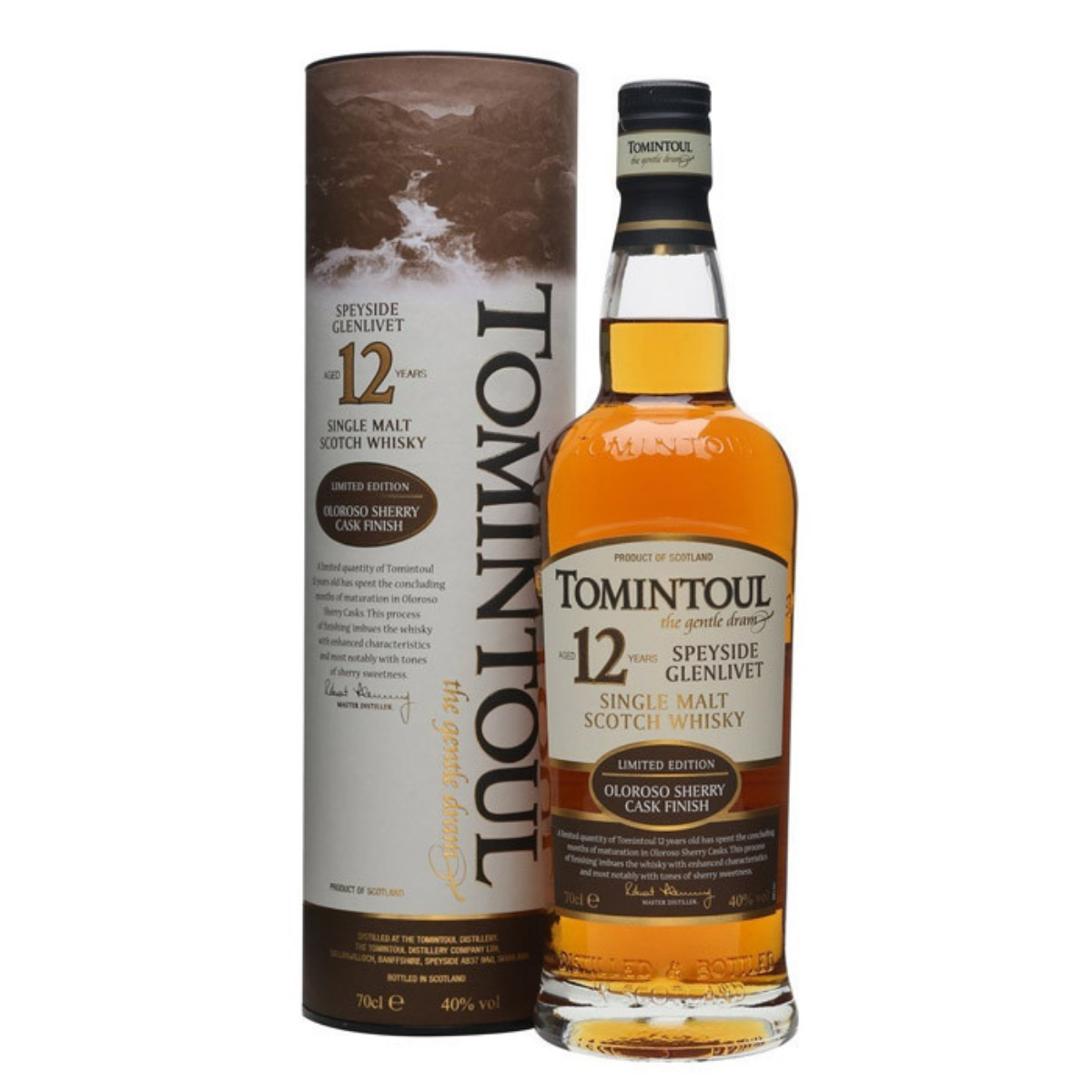 מזקקת טומינטול ממוקמת באזור גלן ליווט בהרי סקוטלנד בכפר שנושא את שם המזקקה “טומינטול”. איכות חומרי הגלם והמים בייצור וויסקי טומינטול 12 – tomintoul 12 sherry cask – הינם ברמה גבוהה ביותר בשל התנאים האידיאליים השוררים שם ונוסף לתנאים אלו חברו גם מיומנות ומסורת בייצור הוויסקי לתוצאה של מוצר איכותי ברמה גבוהה ביותר. וויסקי טומינטול 12 הוא בעל ניחוח פרחוני מתקתק וטעמים משלימים של דובדבנים ועץ. זהו וויסקי חלק ועשיר עם סיומת קרמית מעודנת.
